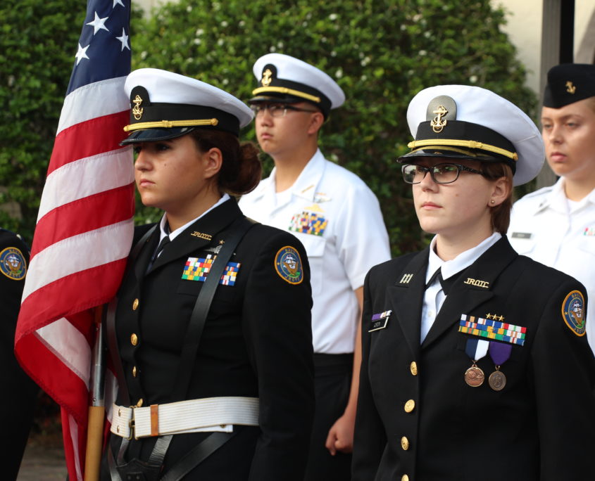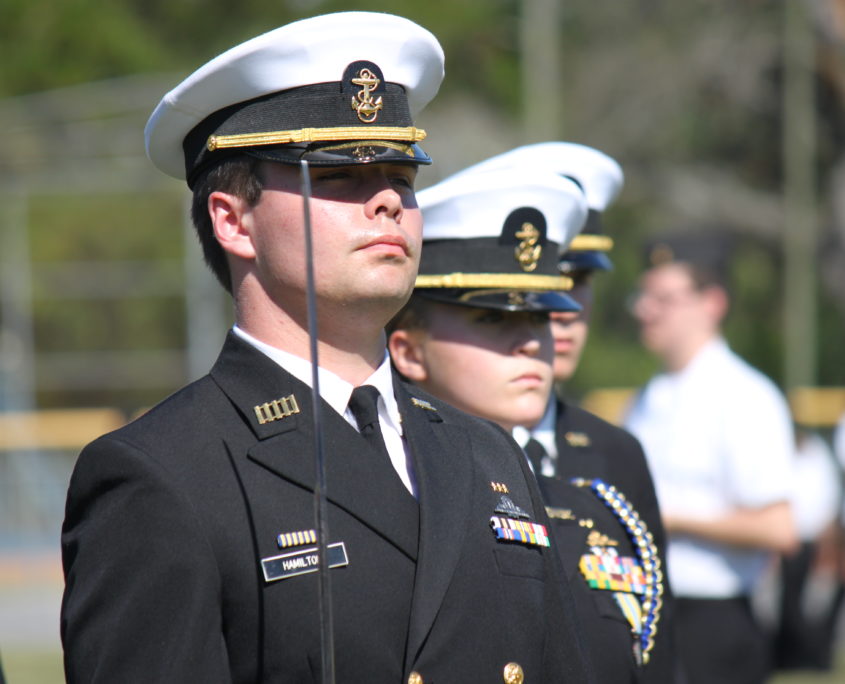 “我认为你不能说得比这更好了,”海军高级科学指导员里克·肖克博士说。 “We have a unique opportunity to combine academic 卓越与品格教育 here in part because of the NJROTC program, and we end up producing fine young men and women prepared for success in our global community in dress blues.”