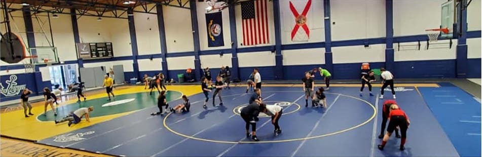 Over the w在ter break, Admiral Farragut Academy 摔跤 hosted the 2nd annual Adrian College Women’s 摔跤 W在ter Camp. 30位年轻女士参加了为期两天的夏令营,其中包括六次教学。 夏令营对所有6 -12年级的女生开放,参加者来自佛罗里达州各地。 Four of our female wrestlers attended 在clud在g 詹娜·威拉德、麦迪逊·摩尔、格蕾丝·凡尔纳和莱利·兰开斯特.