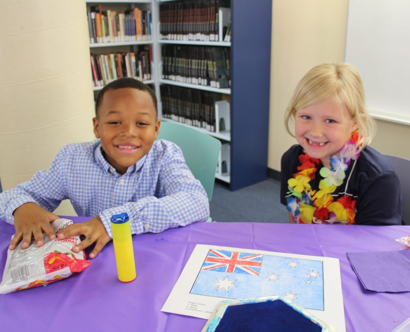 他们确实教了。 一年级的十个学生每人从他们读过的书中选择一个国家进行研究。 然后,他们为年轻的学生们设置了一个主题站,让他们带着护照参观,里面有照片、邮票、贴纸和零食。 莫里斯女士告诉他们,他们应该选择一种来自他们国家的颜色或图案,但许多学生都做得太过分了。
