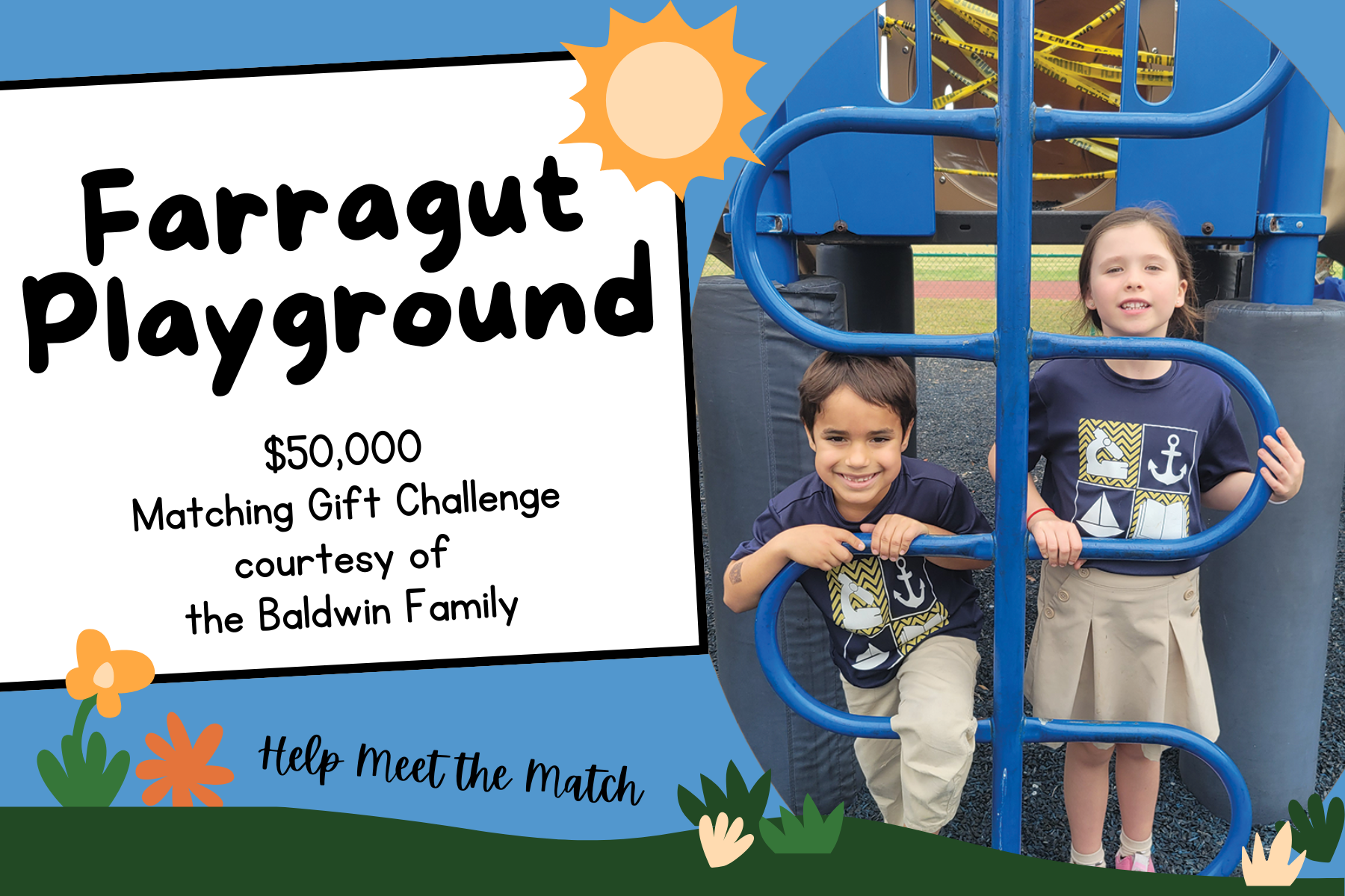 我们很激动地宣布一个新操场的配对礼物挑战! 一年级家长莫妮卡和罗柏·鲍德温已经慷慨地同意为这个项目捐款高达5万美元!